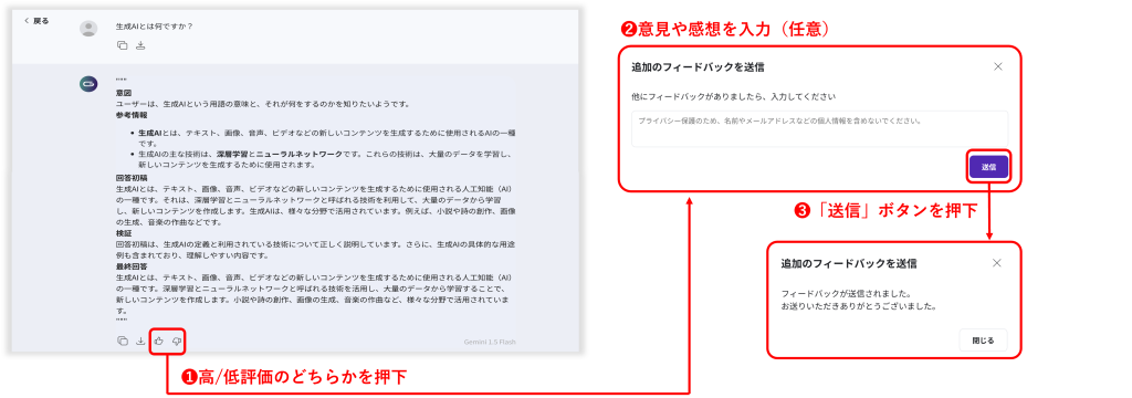 回答下部のフィードバックアイコンから簡単に送信できます。