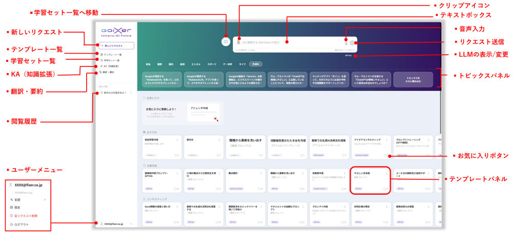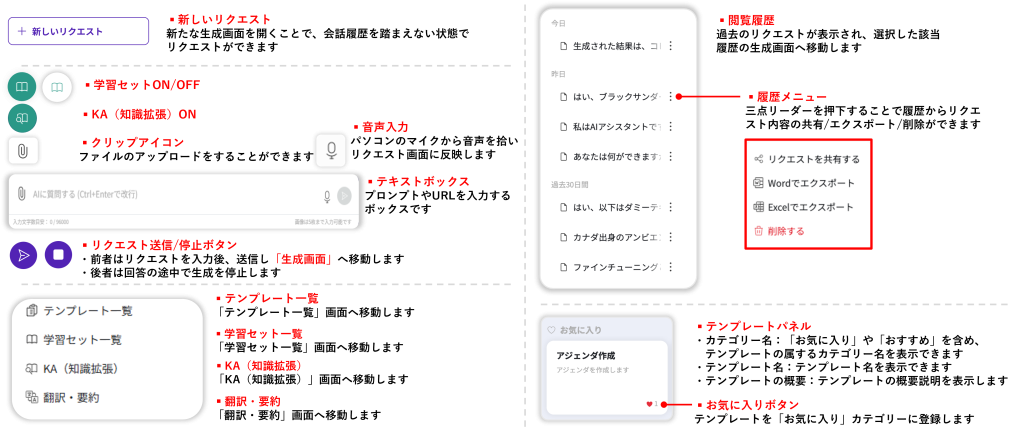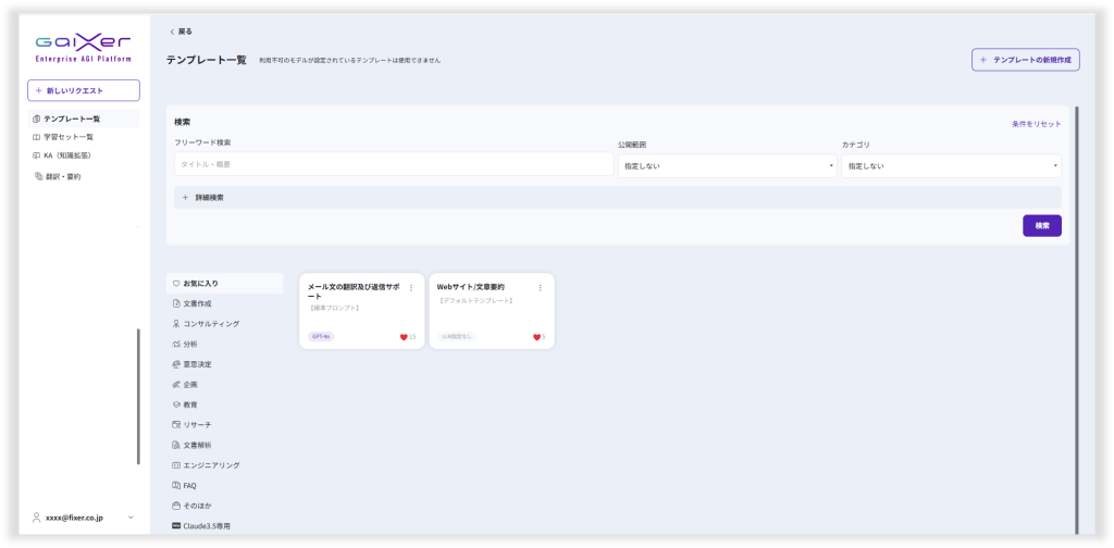 プロンプトを自分で作成しなくても、すぐに利用できるテンプレートがメニューとして揃っており、どなたでもご利用できます。