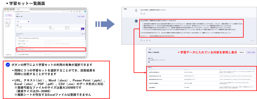 学習セットと比較して、情報源からの検索能力が上がり、PDF内の画像に基づいた回答生成を行うことができます。