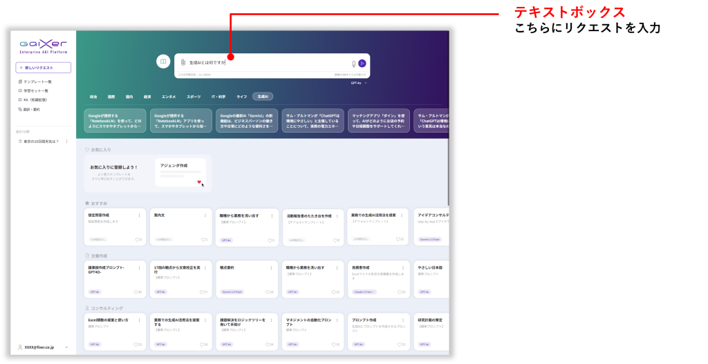 アカウント登録が完了し、GaiXerへアクセスできたら画面上のテキストボックスへテキストを入力してみましょう。この際に入力されるテキストは「プロンプト」と呼ばれます。