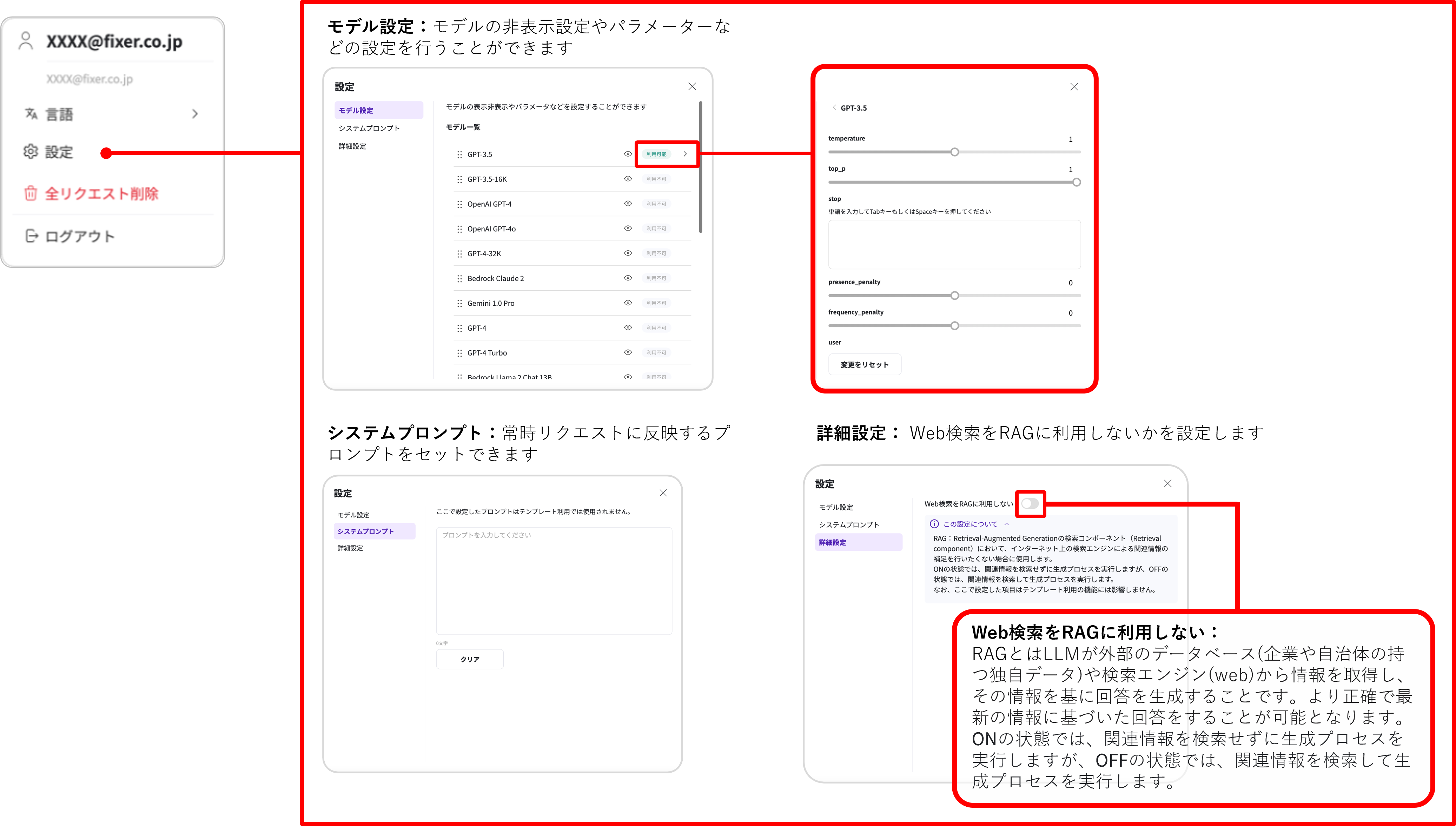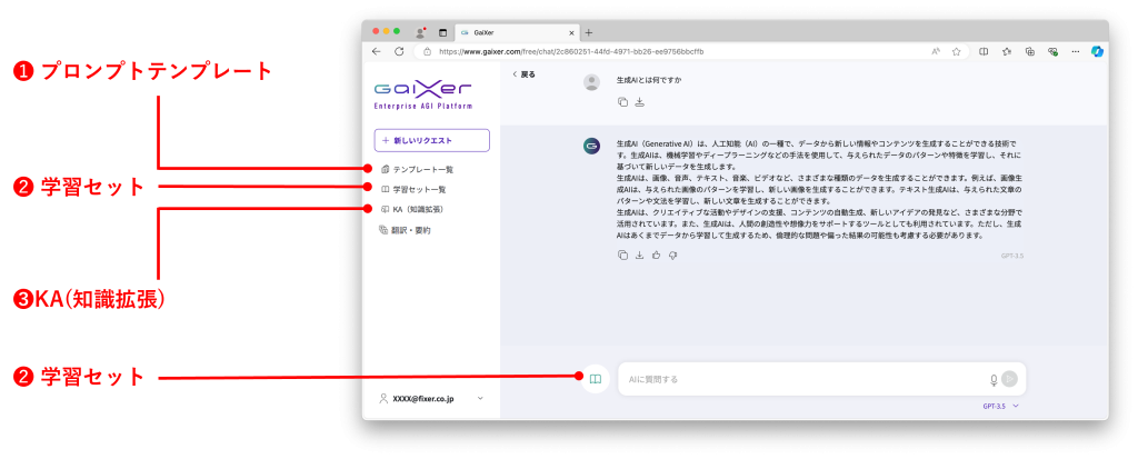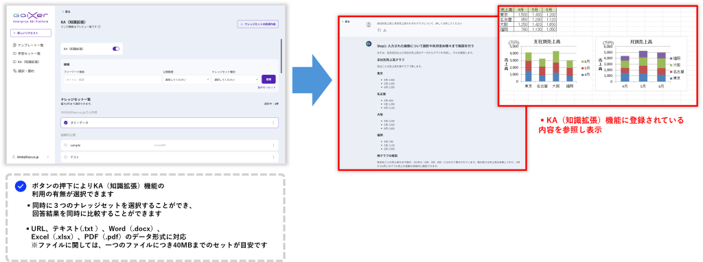 こちらの回答の精度をコントロールするのがプロンプトであり、その設定や環境を大きく動かし、操作する重要項目が上記三箇所の「プロンプトテンプレート」「学習セット」「KA(知識拡張)」です。
