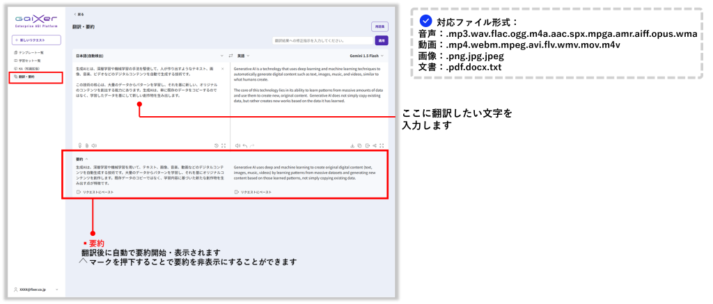翻訳した結果や要約を、メイン画面に自動で転記して生成させることもできます。