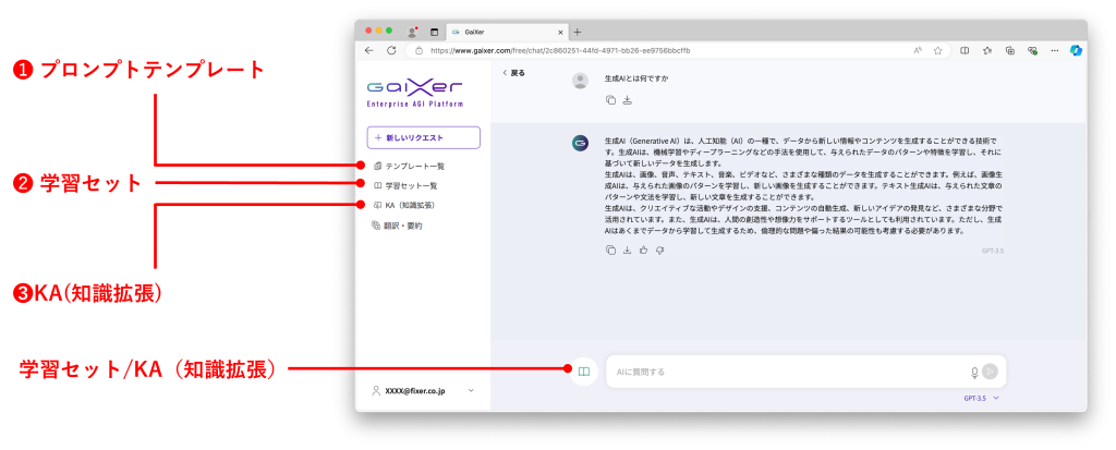 こちらの回答の精度をコントロールするのがプロンプトであり、その設定や環境を大きく動かし、操作する重要項目が上記三箇所の「プロンプトテンプレート」「学習セット」「KA(知識拡張)」です。