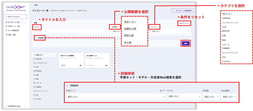 テンプレートのタイトルや公開範囲、カテゴリを選択しテンプレート全体から検索することができ