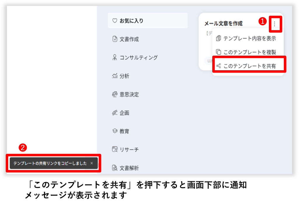 1.テンプレート一覧画面にて、共有したいテンプレートの三点リーダーを押下し