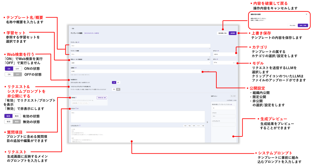 こちらの画面ではGaiXerにデフォルトで備わっているプロンプトテンプレート、またはユーザーの作成したテンプレートへのアクセスができます。「テンプレート一覧」を押下することで表示されます。