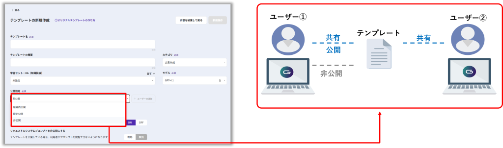 テンプレートの「新規作成」および「編集」時に公開設定をすることでテンプレートを共有することができます。