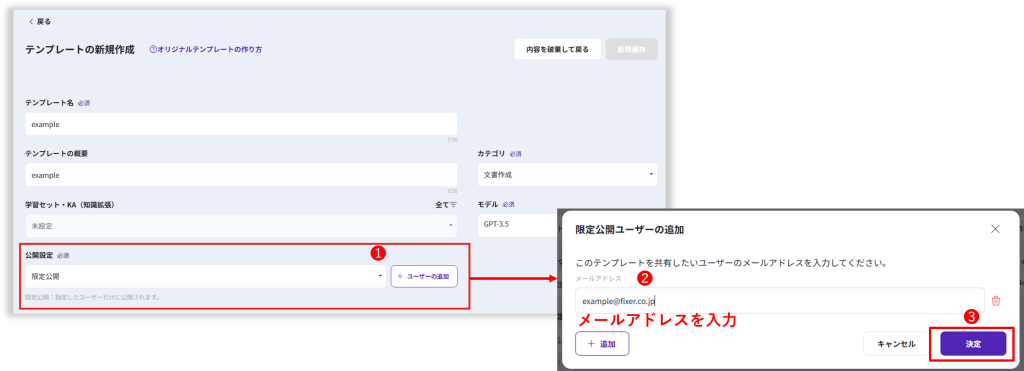 テンプレートの限定公開機能では指定したメールアドレスのユーザーにのみテンプレートを共有することができます。